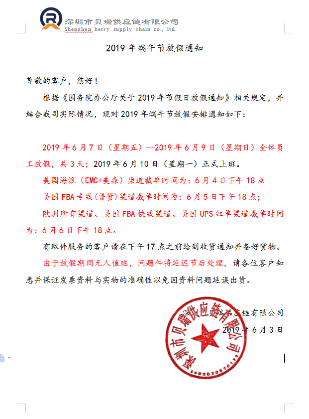 2019年端午节放假通知